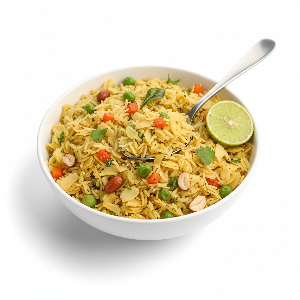 Poha is a popular Indian breakfast or snack made from flattened rice flakes, typically seasoned with spices, turmeric, onions, peanuts, and curry leaves. It is a light, easily digestible, and quick-to-prepare dish, often garnished with fresh coriander and a squeeze of lemon juice.